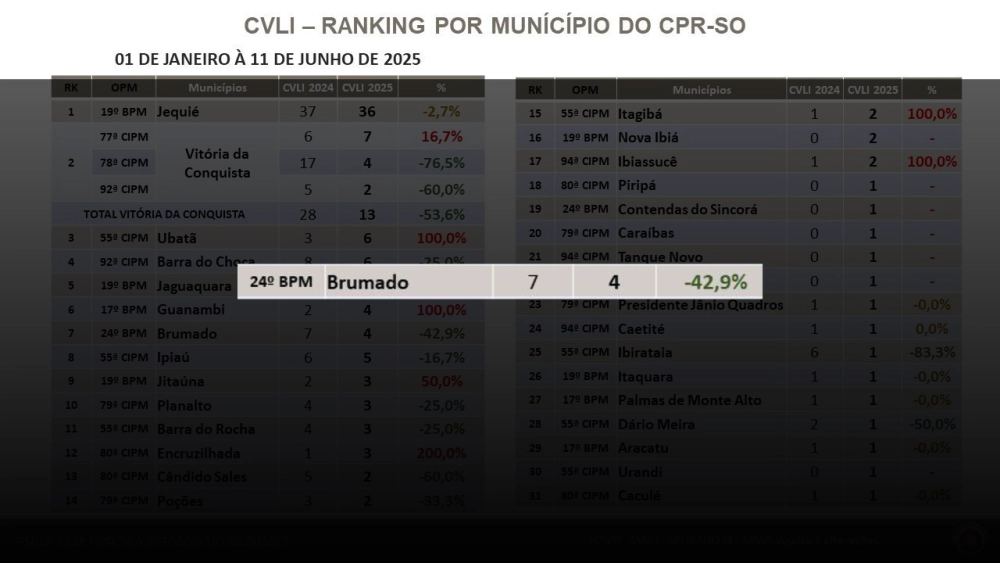 Brumado registrou uma importante redução nos índices de homicídio entre os dias 1º de janeiro e 11 de junho de 2025. De acordo com dados divulgados pelo Comando de Policiamento Regional do Sudoeste (CPR-SO), o município apresentou uma queda de 42,9% nos Crimes Violentos Letais Intencionais (CVLI), com 4 ocorrências registradas neste ano contra 7 no mesmo período de 2024.